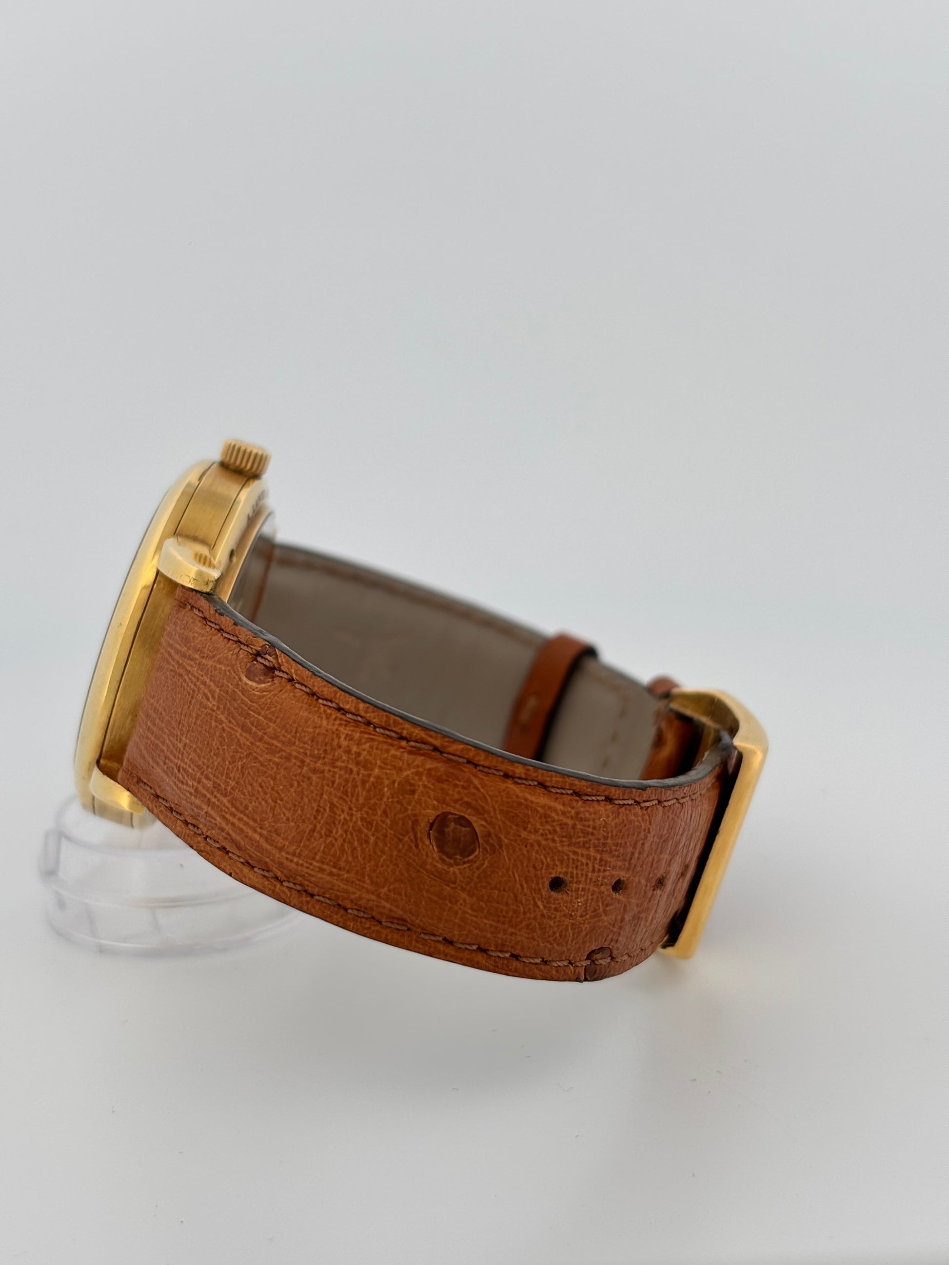 Réalisée en or jaune 18 carats, cette montre allie élégance intemporelle et excellence mécanique.