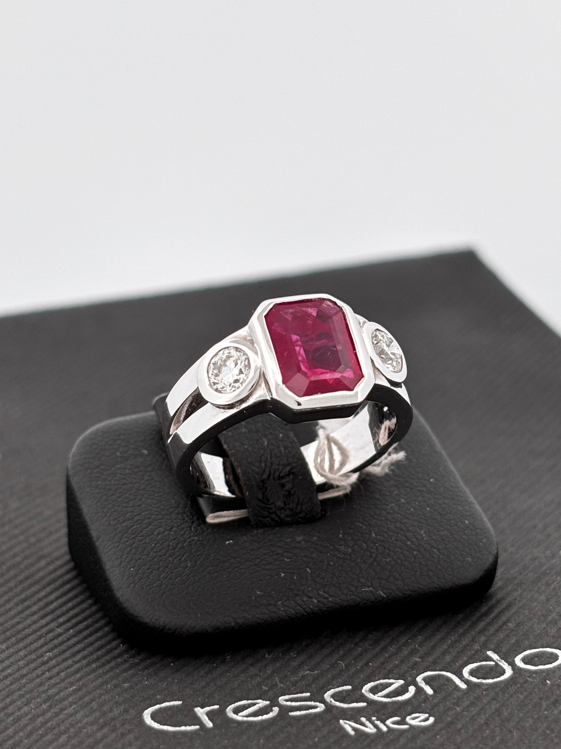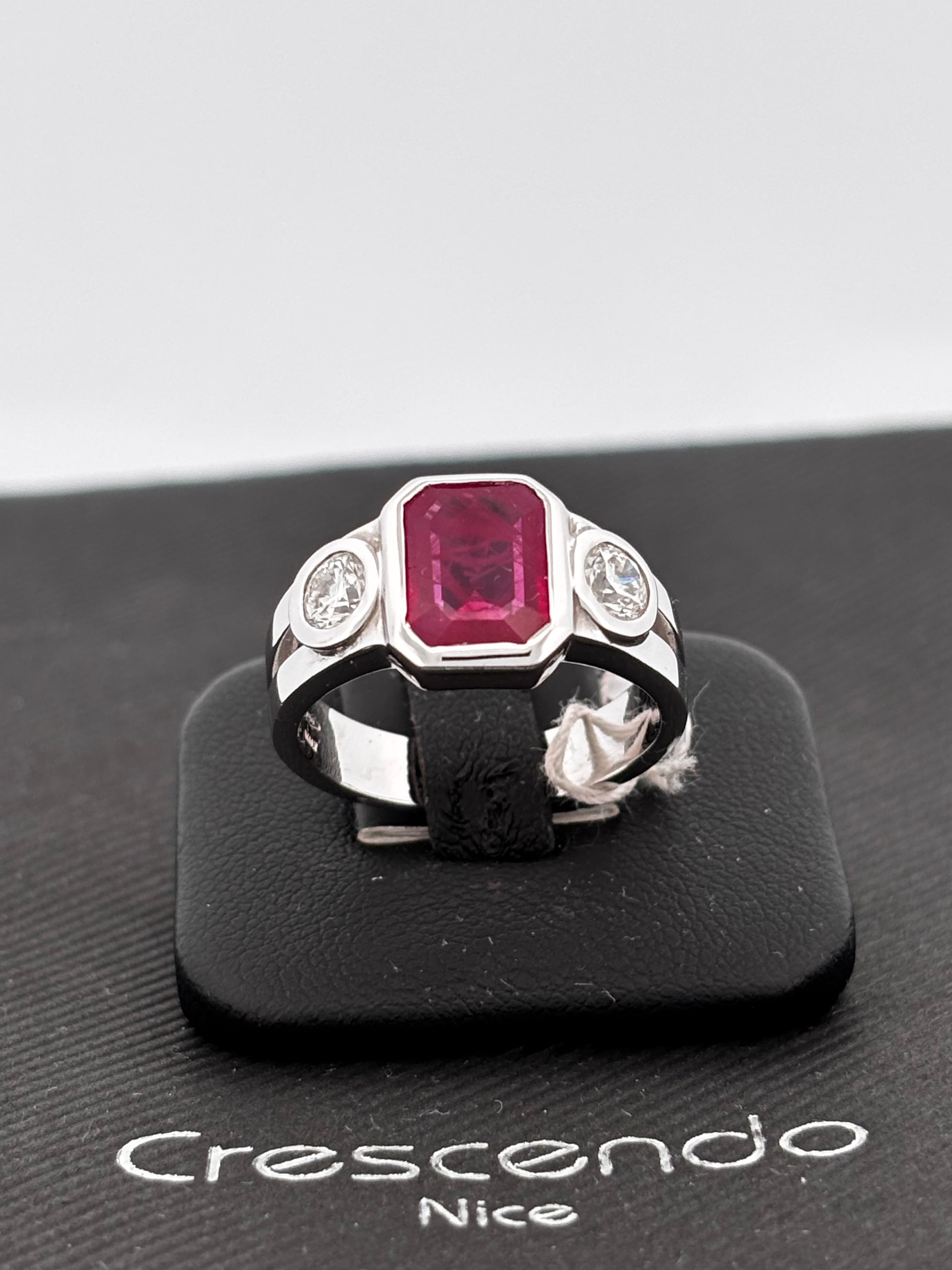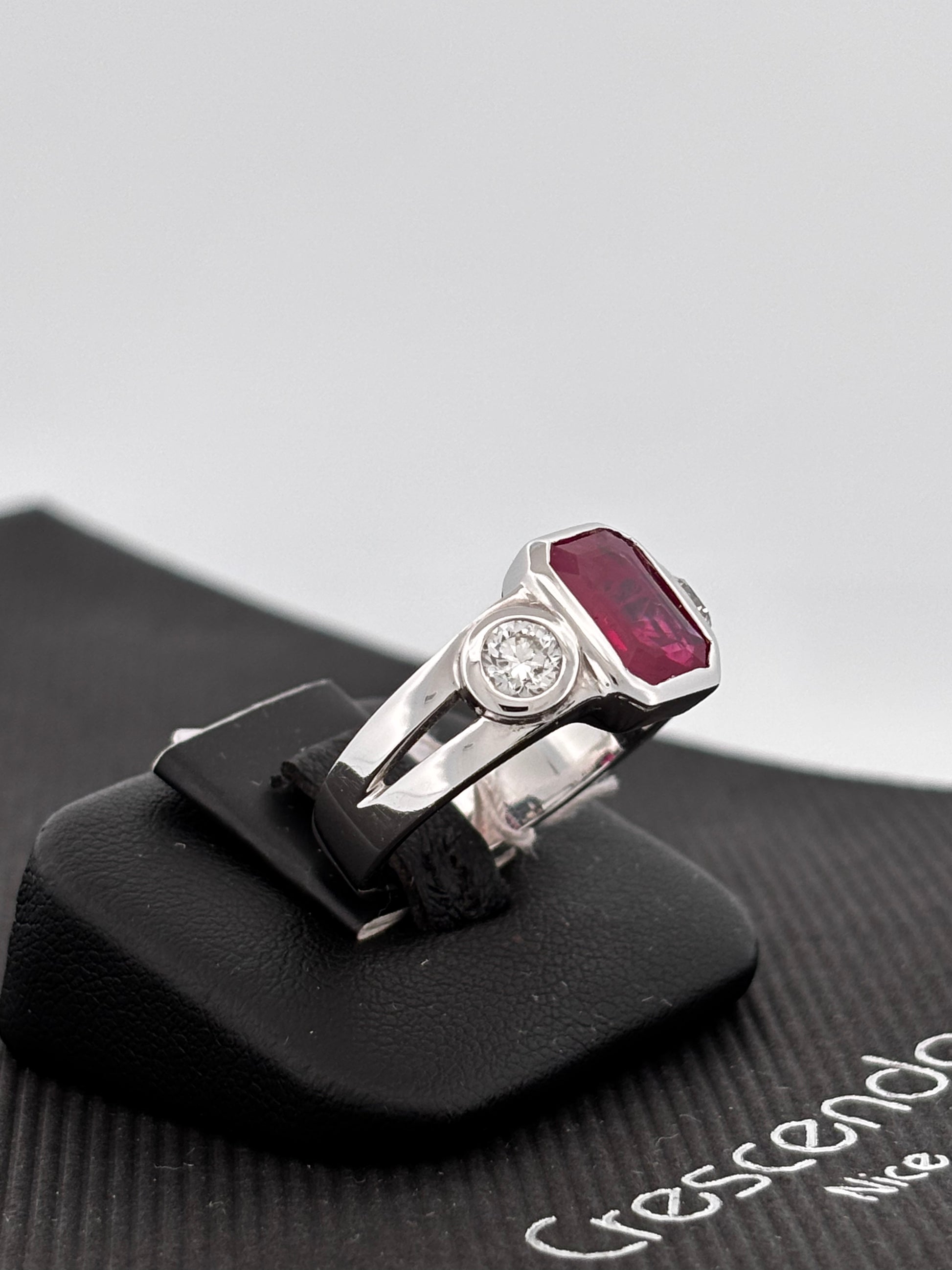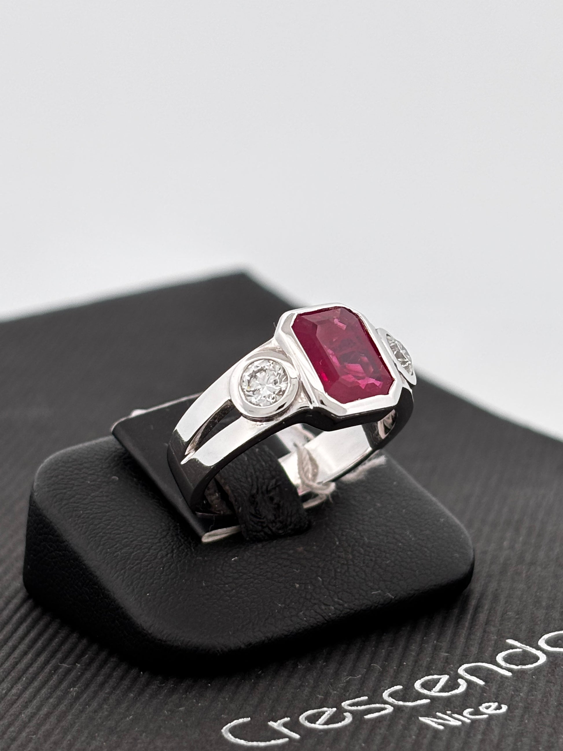 Somptueuse bague en or blanc 18 carats, ornée d’un rubis naturel non chauffé d’environ 3,00 carats, taille émeraude, à la couleur rouge vive et saturée — un éclat rare et recherché dans la joaillerie contemporaine.