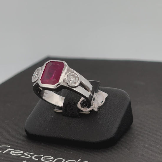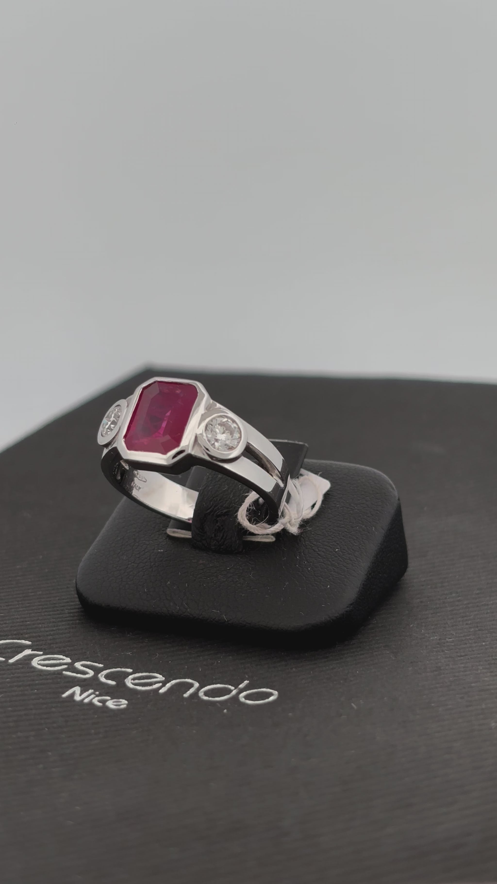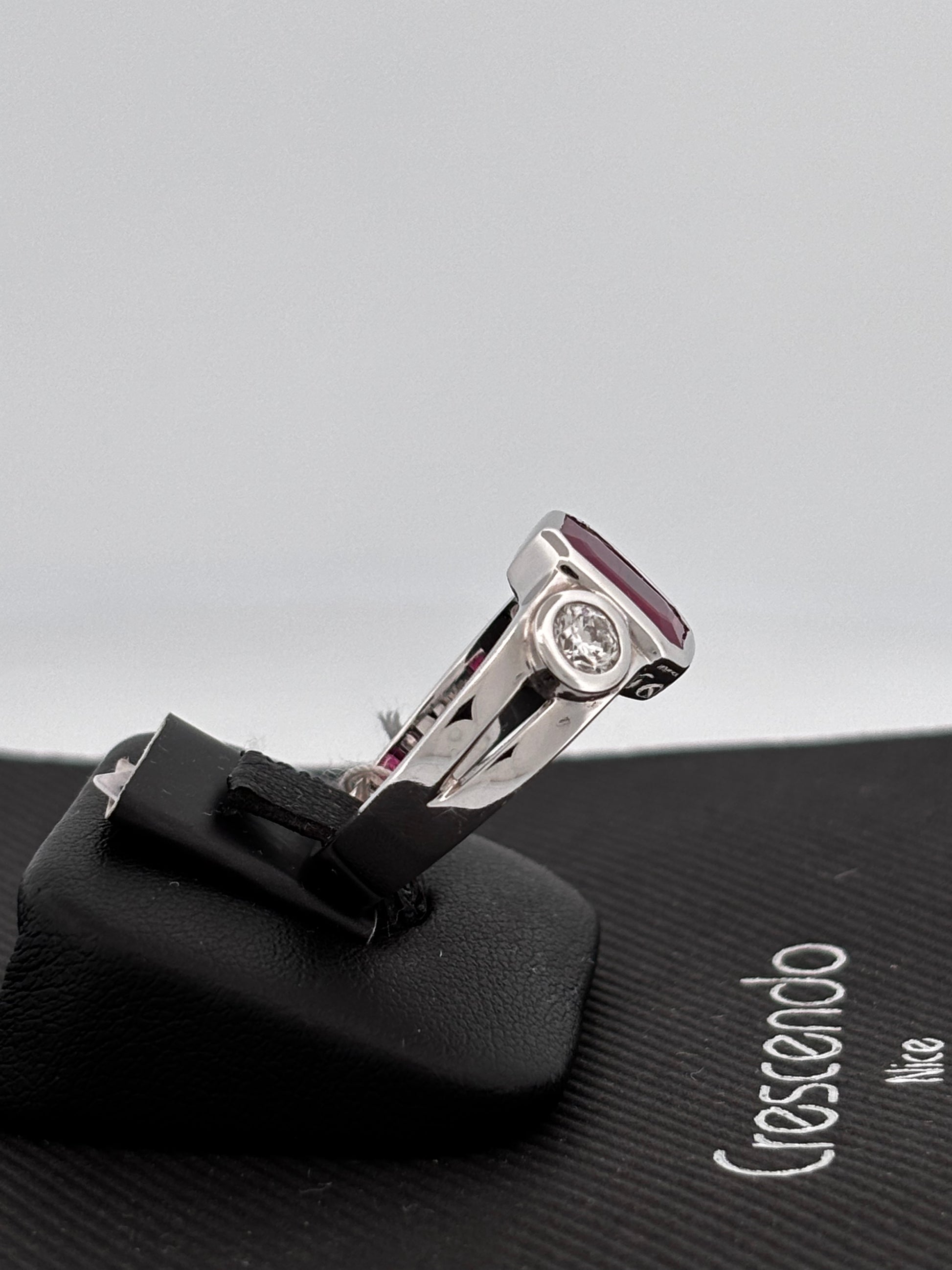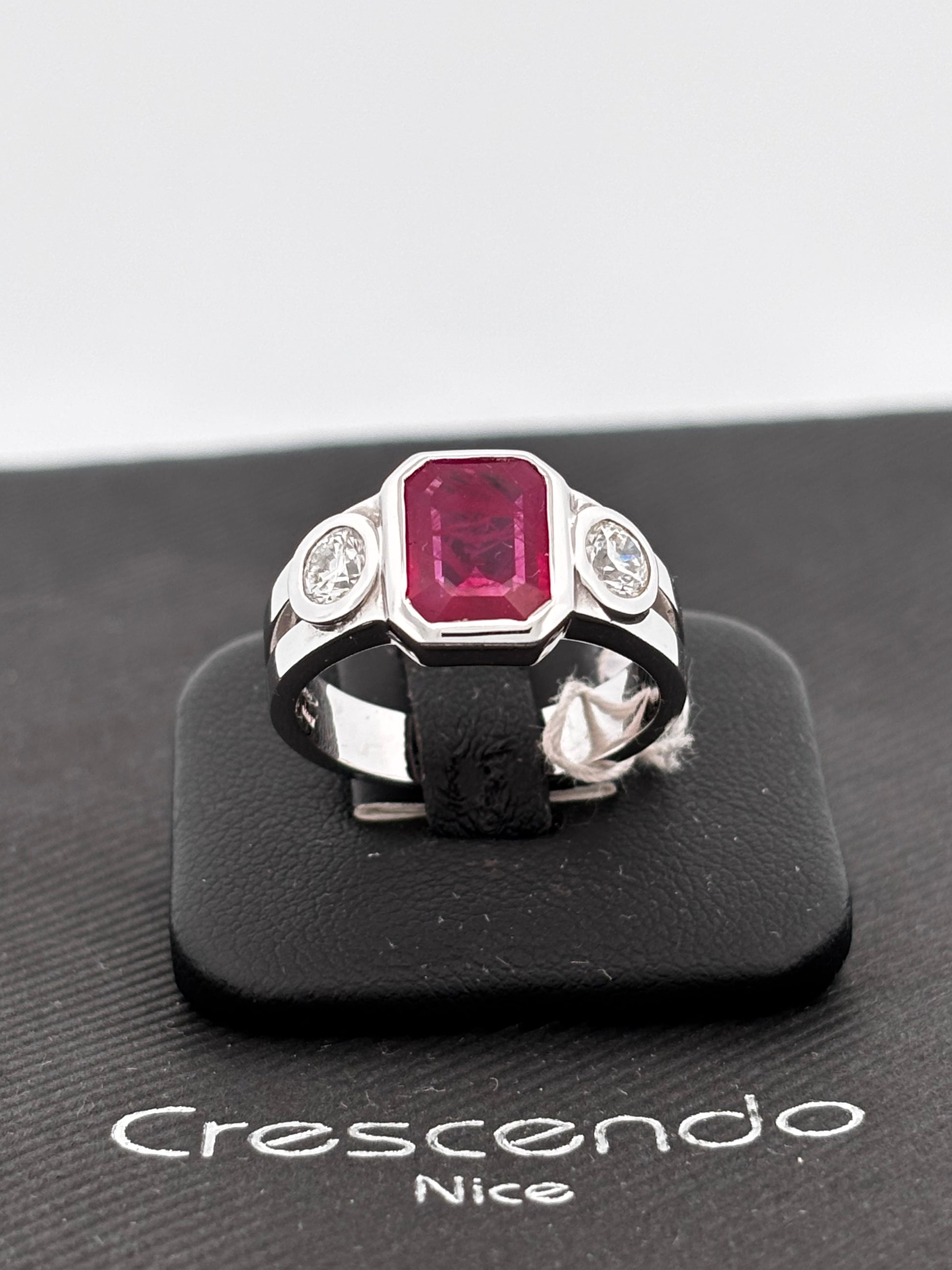 Somptueuse bague en or blanc 18 carats, ornée d’un rubis naturel non chauffé d’environ 3,00 carats, taille émeraude, à la couleur rouge vive et saturée — un éclat rare et recherché dans la joaillerie contemporaine.