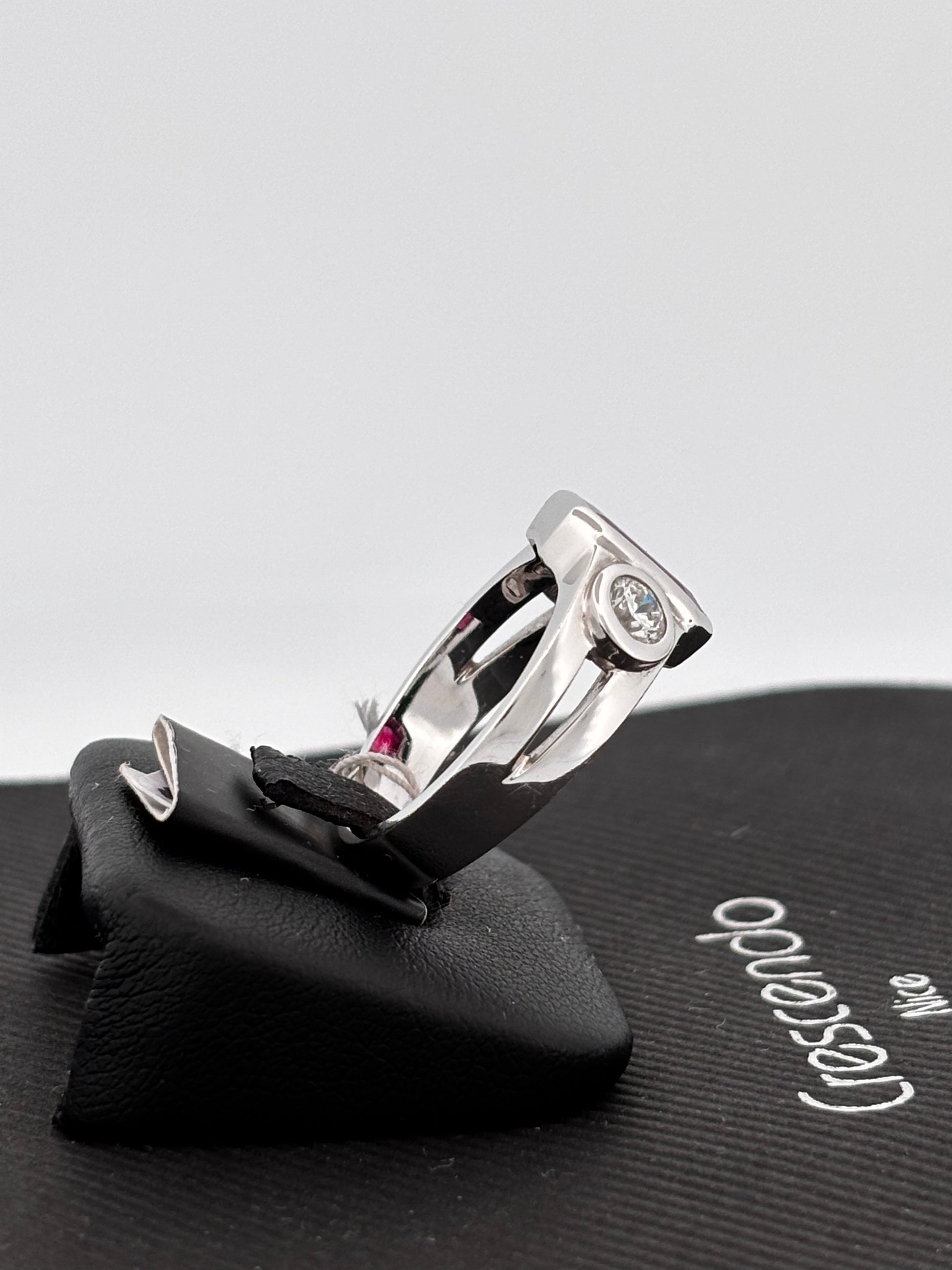 Le design de la monture s’inspire du style Art Déco revisité, aux lignes géométriques et structurées. L’or blanc poli miroir renforce le contraste entre la pureté des diamants et la chaleur du rubis.