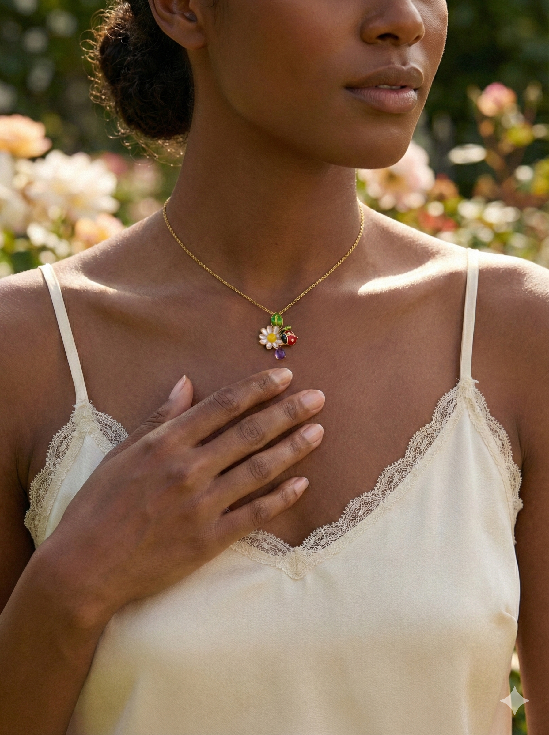 Le pendentif, riche en détails, met en scène une marguerite émaillée rose et jaune, une coccinelle rouge & noire emblématique de la Maison, ainsi qu’une élégante goutte d’améthyste facettée en pendentif final.