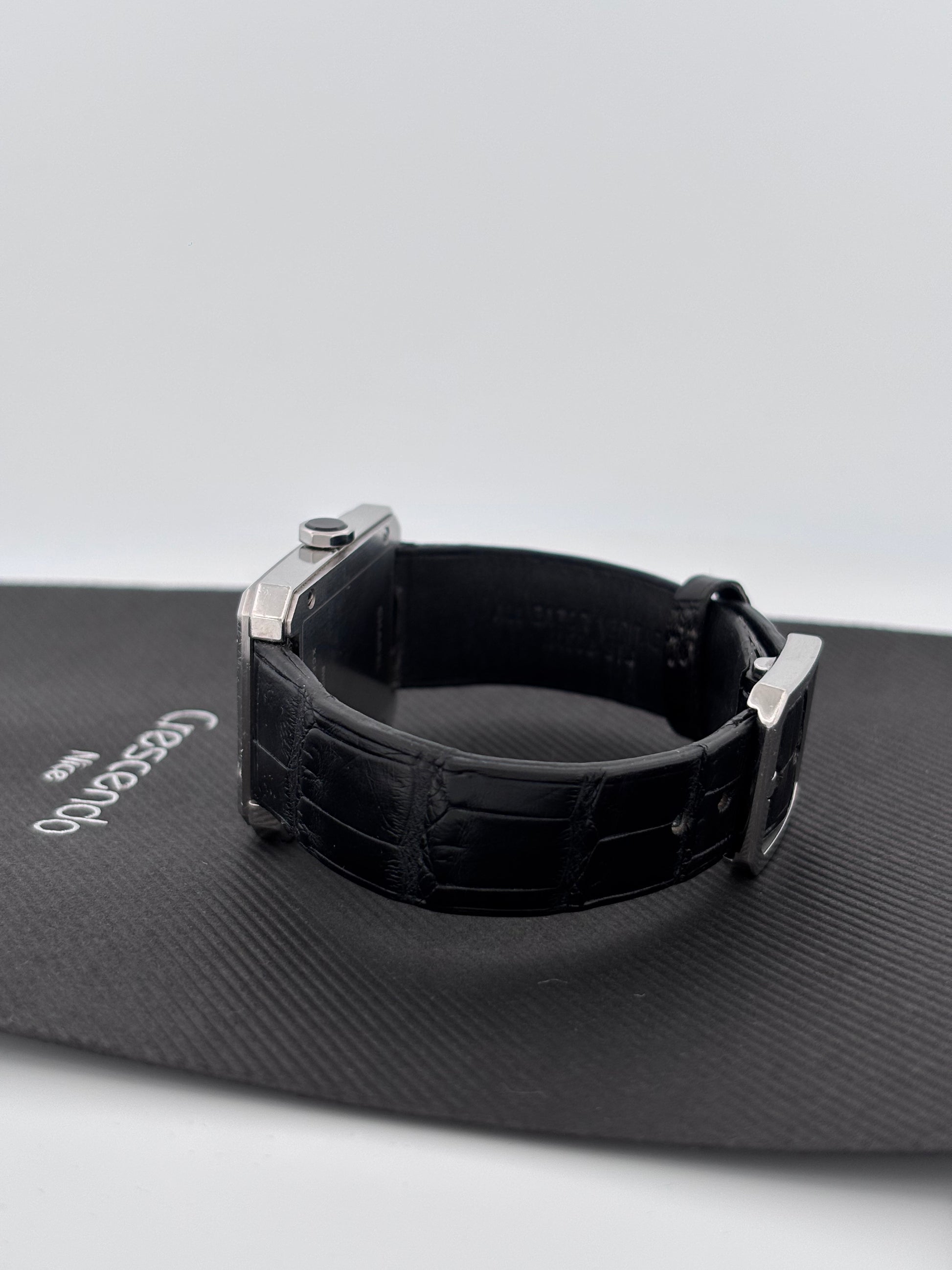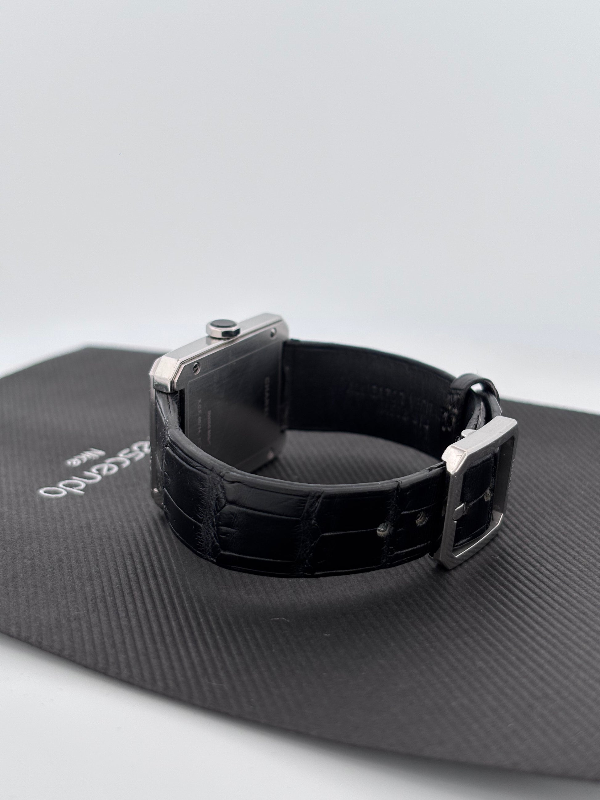 Son boîtier rectangulaire en acier poli, inspiré du célèbre flacon de parfum N°5, entoure un cadran noir laqué minimaliste d’une grande sobriété, sans chiffres ni artifices — un style à la fois architectural et sensuel.