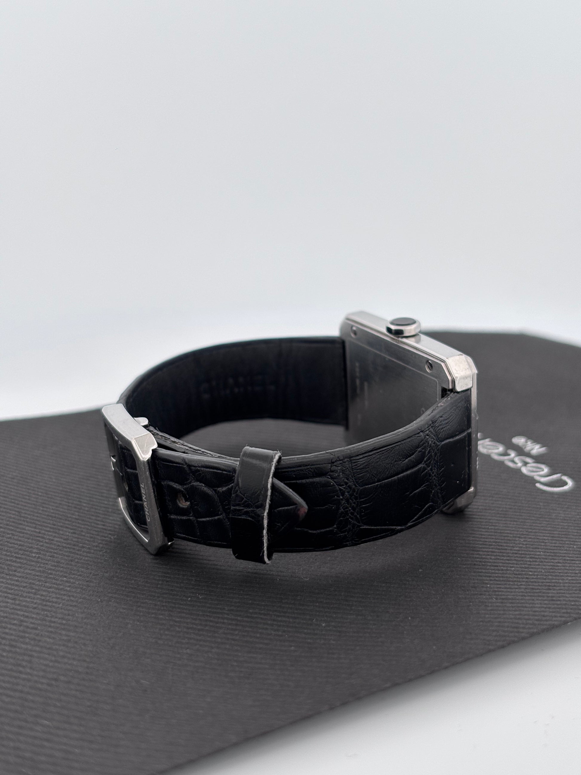 Son bracelet en cuir d’alligator noir sublime la pureté du dessin, tandis que la boucle ardillon signée CHANEL parachève cet ensemble au raffinement absolu.