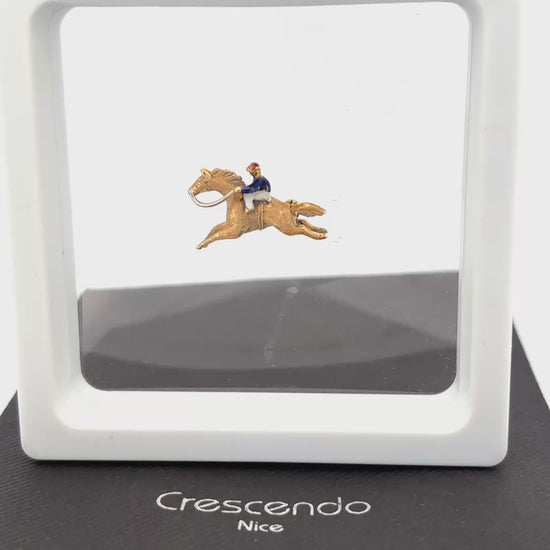 Élégance, mouvement et symbolique : cette broche rare en or 18 carats incarne à la perfection l’art équestre et le raffinement bijoutier. Finement ciselée, elle représente un cavalier en pleine course, capturant l’instant avec une précision remarquable.