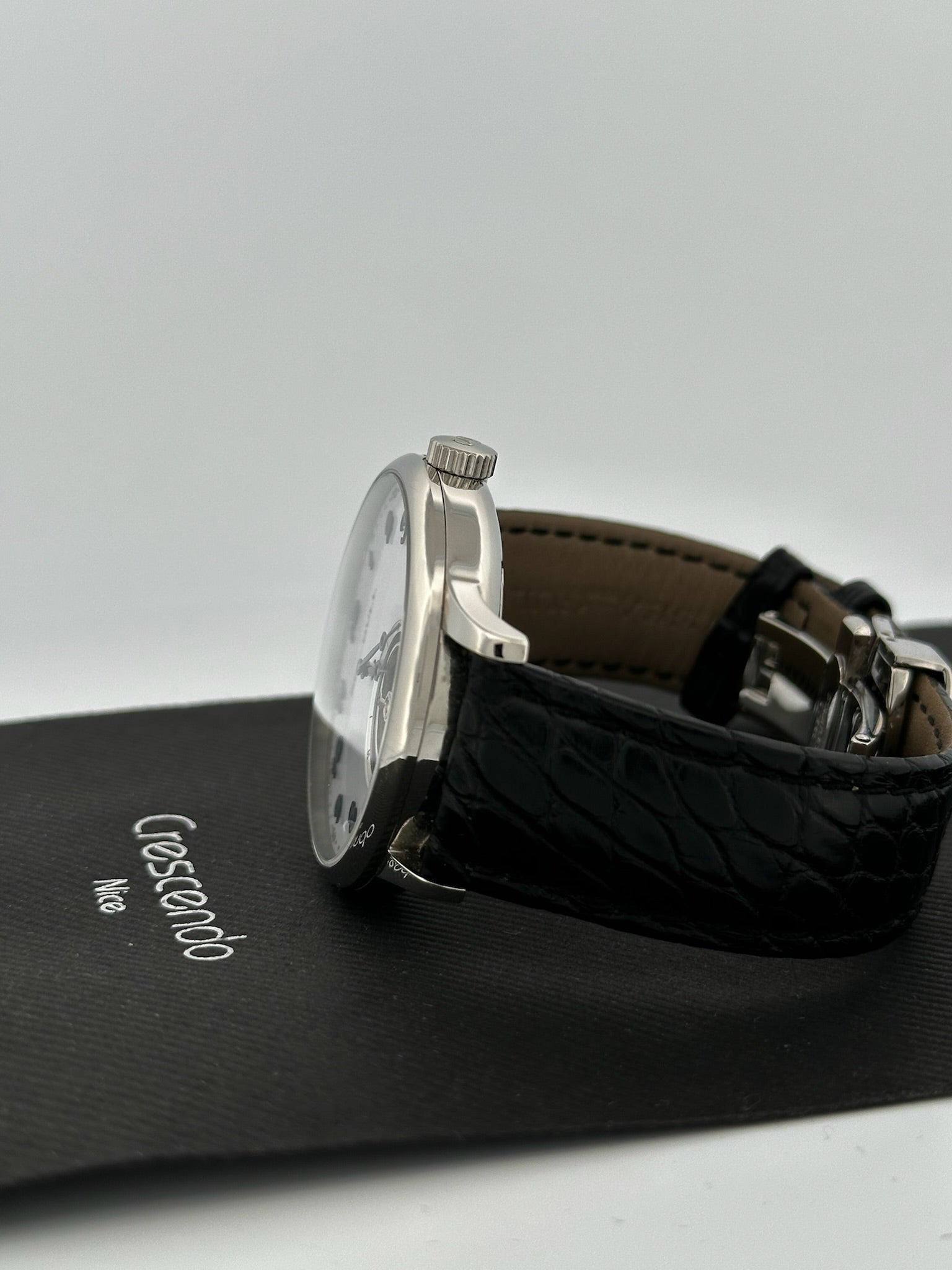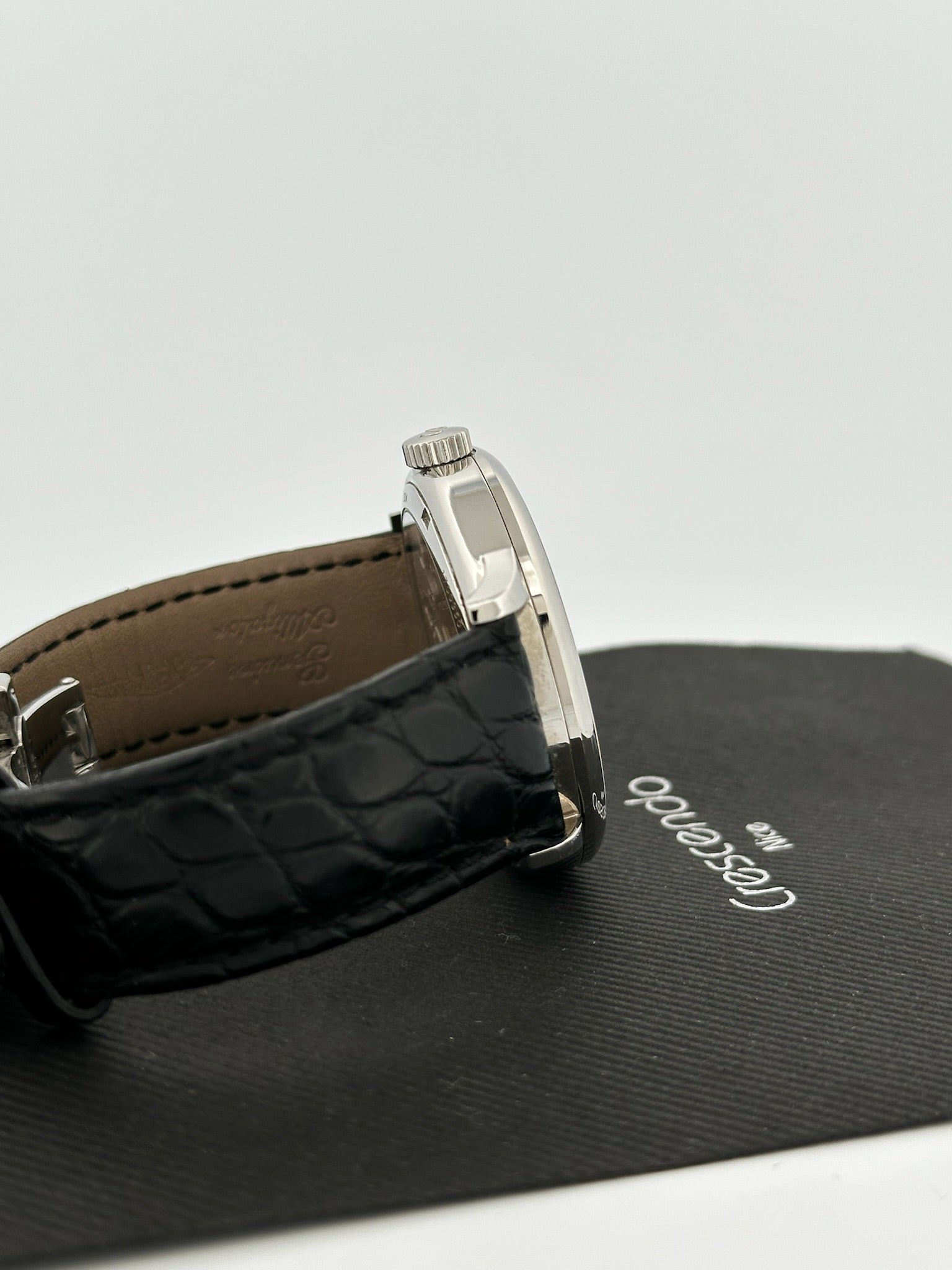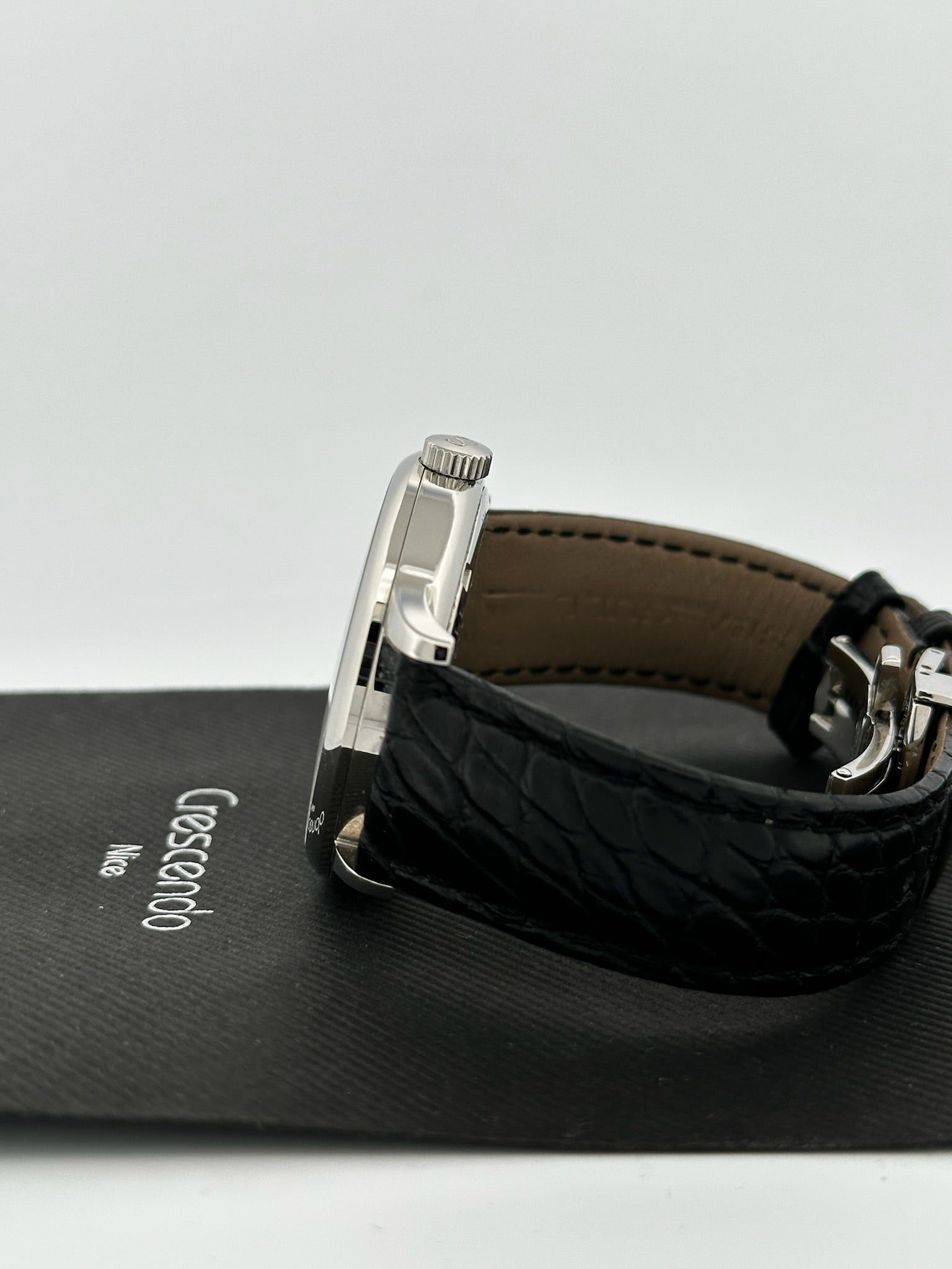 - Bracelet : Cuir noir façon alligator, boucle déployante siglée