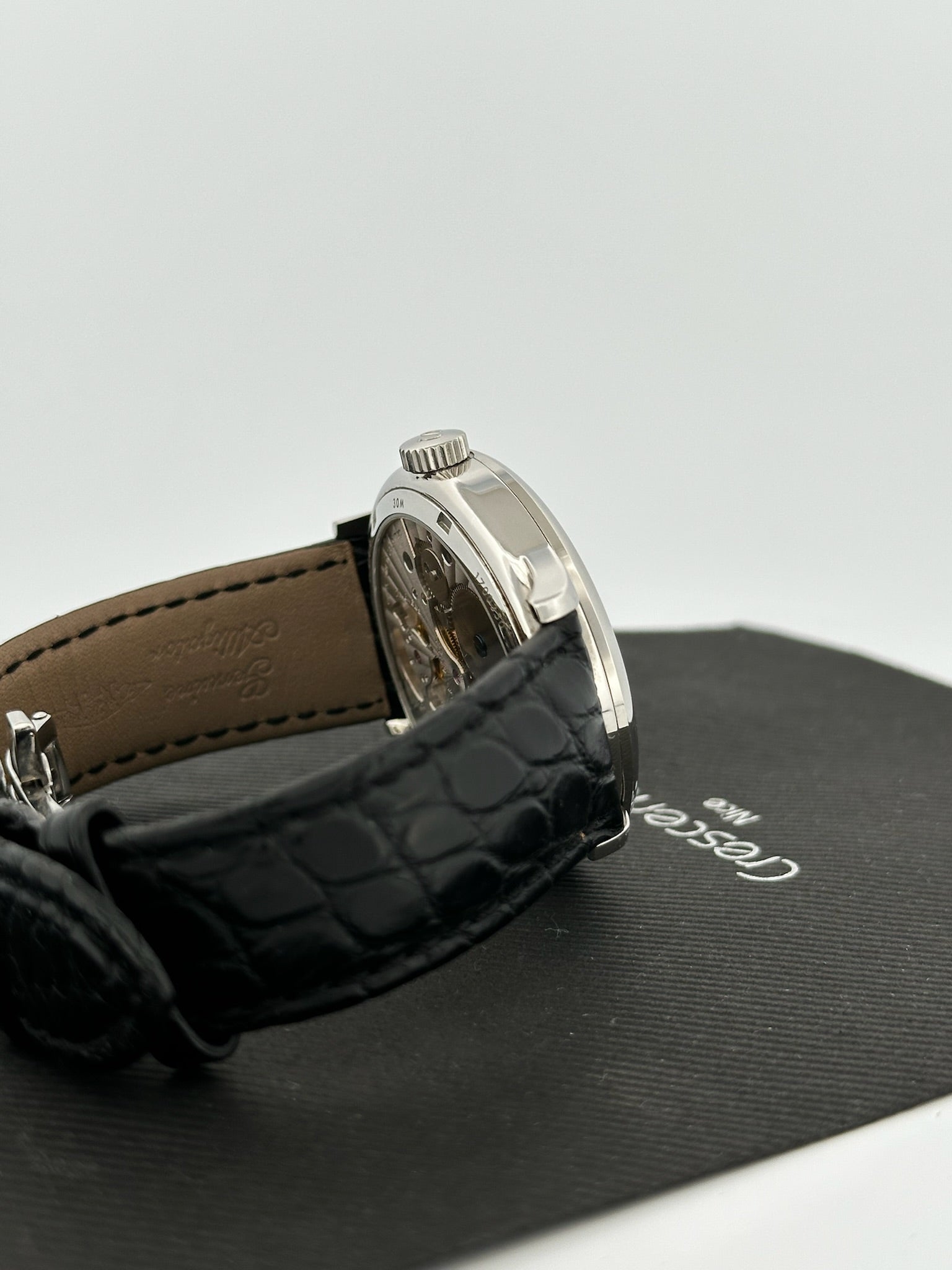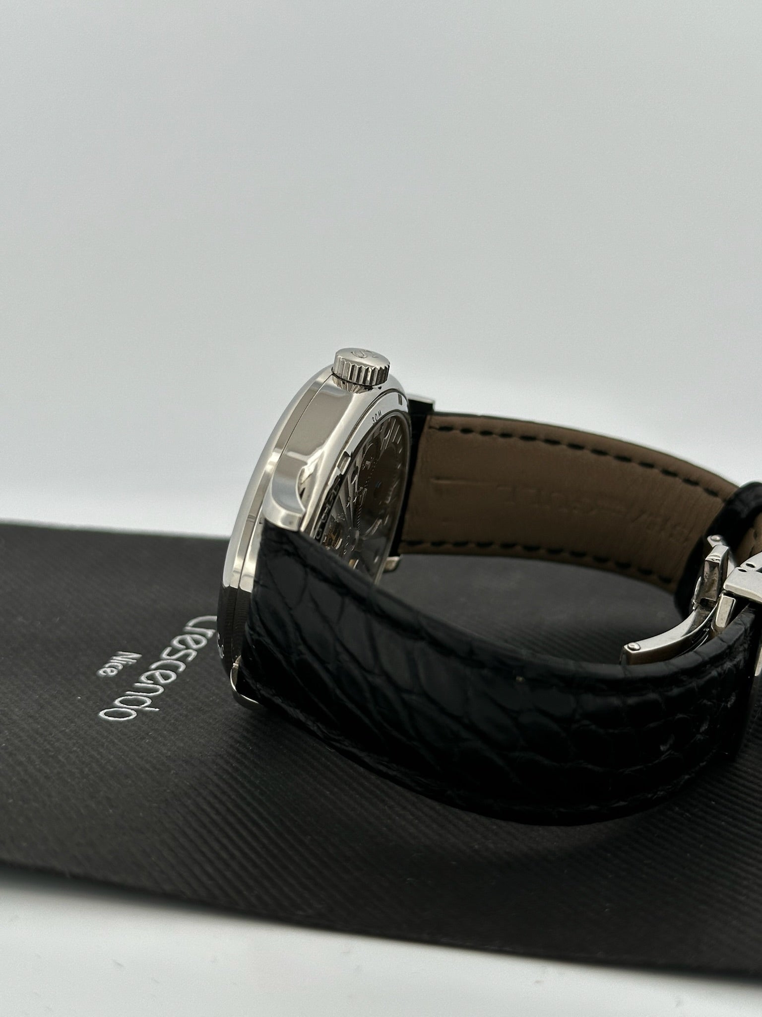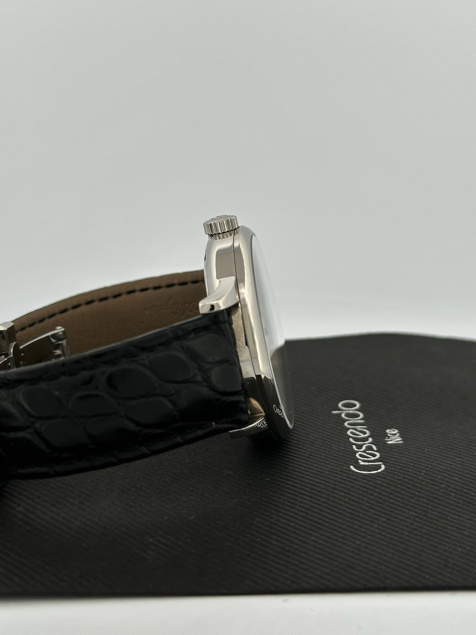 - Bracelet : Cuir noir façon alligator, boucle déployante siglée